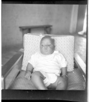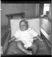 816. EAP449/2/28/816 Reference (shelfmark): EAP449/2/28/816 Title: A baby wearing a shirt sitting in profile on a chair in front of a bench in a room. Collection Area: Endangered Archives Programme Languages: Not applicable Date Range: 2nd half od the 20th century Extent: 1 TIFF image