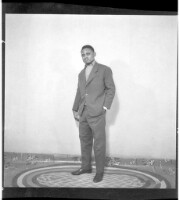 828. EAP449/2/28/828 Reference (shelfmark): EAP449/2/28/828 Title: A man wearing a suit and glasses standing in profile in the studio. Collection Area: Endangered Archives Programme Languages: Not applicable Date Range: 2nd half od the 20th century Extent: 1 TIFF image