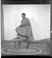 863. EAP449/2/28/863 Reference (shelfmark): EAP449/2/28/863 Title: A woman wearing a dress standing in profile, posing with her foot on a stool with her hands in a bag in the studio. Collection Area: Endangered Archives Programme Languages: Not applicable Date Range: 2nd half od the 20th century Extent: 1 TIFF image