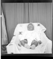 872. EAP449/2/28/872 Reference (shelfmark): EAP449/2/28/872 Title: A baby wearing a jumpsuit and hat sitting in profile on a chair in the studio. Collection Area: Endangered Archives Programme Languages: Not applicable Date Range: 2nd half od the 20th century Extent: 1 TIFF image