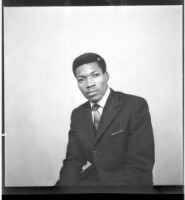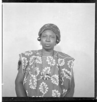 A woman wearing a black and white dress, earrings, a watch on her left hand, and white shoes with her hair styled standing face-forward on a rug in the studio.