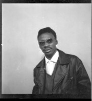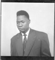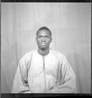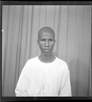 A man wearing a shirt and pants sitting with his arms crossed next to a little girl wearing a white camisole, a pagne, a necklace, and earrings standing, a little boy wearing a grey shirt and overalls, and a man standing behind wearing a black shirt and p