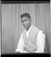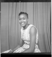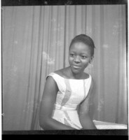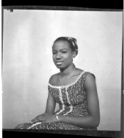 A photo of 11 people: 5 little girls, a little boy, 4 women wearing dresses, head wraps, and necklaces - two sitting and two standing - and a man wearing a jacket, tie, and hat standing in profile in the studio.