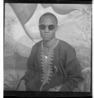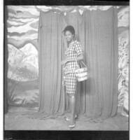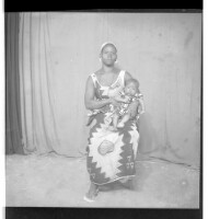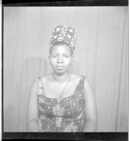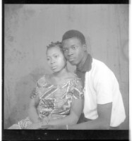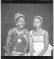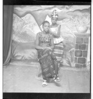 Two girls wearing dresses and pagnes, one sitting in profile in front of the other wearing a head wrap and standing in profile in a studio decorated with clouds, flowers, and a flower pot on a little wall.