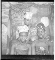 Two girls wearing dress and head wraps, one wearing a necklace, both sitting face-forward in front of another wearing a dress and head wrap standing in profile, all in a studio decorated with a sun rising on some surrounding trees.