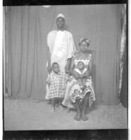 A man wearing a boubou and hat standing face-forward holding the hand of a little boy standing face-forward next to a woman wearing a dress and head wrap holding a baby on her lap sitting face-forward in the studio.