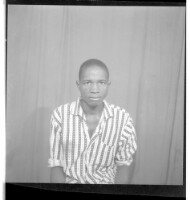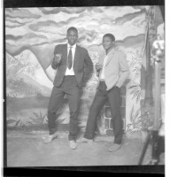 A woman wearing a dress and head wrap sitting face-forward in between an old man wearing a boubou and hat standing in profile and a man wearing a shirt and pants standing in profile in the studio.