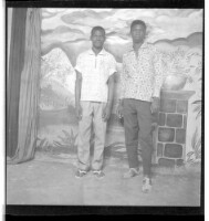 A man wearing a shirt, pants, and a beret sitting face-forward next to a another man wearing a suit, tie, and glasses sitting in profile in a studio decorated with a sun rising on a mosque and some surrounding trees.