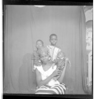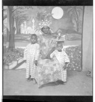 A woman wearing a dress, head wrap, and necklace sitting face-forward holding up a child in front of two little boys wearing shirts standing face-forward in the studio.
