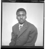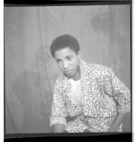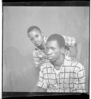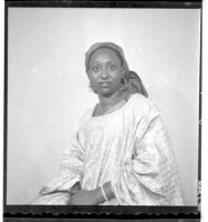 A man wearing a suit and tie next to a woman wearing a dress and head wrap, both sitting in profile in front of two men, one wearing a t-shirt standing in profile next to the other wearing a suit standing face-forward in the studio.