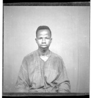 An old man wearing a boubou and hat sitting in profile in front of a man wearing a suit and glasses standing face-forward in a studio decorated with clouds, flowers, and a flower pot on a little wall.