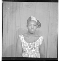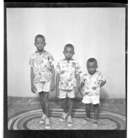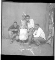 A little girl wearing a dress and head wrap standing face-forward in front of three men wearing shirts and pants, one wearing glasses, one of whom is sitting face-forward on a stool and the other two are crouching down in profile and face-forward in the