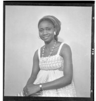 125. EAP449/2/29/125 Reference (shelfmark): EAP449/2/29/125 Title: A woman wearing a dress, head wrap, and necklace sitting in profile in the studio. Collection Area: Endangered Archives Programme Languages: Not applicable Date Range: 2nd half od the 20th century Extent: 1 TIFF image