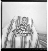 132. EAP449/2/29/132 Reference (shelfmark): EAP449/2/29/132 Title: A little boy wearing overalls sitting face-forward in the studio. Collection Area: Endangered Archives Programme Languages: Not applicable Date Range: 2nd half od the 20th century Extent: 1 TIFF image