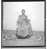 138. EAP449/2/29/138 Reference (shelfmark): EAP449/2/29/138 Title: A woman wearing a dress, head wrap, and necklace sitting face-forward holding a child on her lap with a little girl standing face-forward beside her in the studio. Collection Area: Endangered Archives Programme Languages: Not applicable Date Range: 2nd half od the 20th century Extent: 1 TIFF image