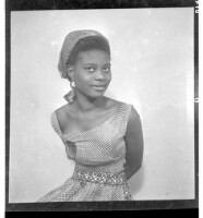 140. EAP449/2/29/140 Reference (shelfmark): EAP449/2/29/140 Title: A girl wearing a dress and head wrap sitting face-forward in the studio. Collection Area: Endangered Archives Programme Languages: Not applicable Date Range: 2nd half od the 20th century Extent: 1 TIFF image