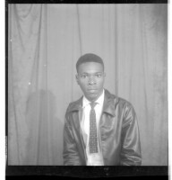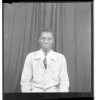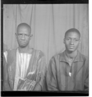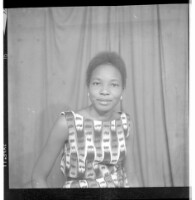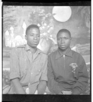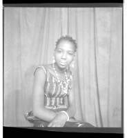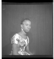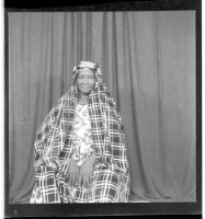 A man wearing a shirt and pants standing in profile next to a girl wearing a dress, head wrap, and necklace standing face-forward in a studio decorated with a sun rising on some surrounding trees.