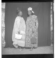 A woman wearing a dress, head wrap, and necklace standing in profile serving a drink to a man wearing a shirt, pants, and glasses next to a another man wearing a suit, tie, and glasses holding a bottle and a fan, all standing in profile in a room with cha