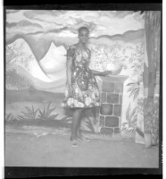 201. EAP449/2/29/201 Reference (shelfmark): EAP449/2/29/201 Title: A girl wearing a dress, pagne, head wrap, glasses, and necklace in a studio decorated with a sun rising on a mosque and some surrounding trees. Collection Area: Endangered Archives Programme Languages: Not applicable Date Range: 2nd half od the 20th century Extent: 1 TIFF image