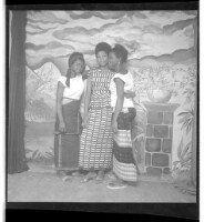 205. EAP449/2/29/205 Reference (shelfmark): EAP449/2/29/205 Title: Three girls wearing dresses and pagnes all standing in profile in a studio decorated with clouds, flowers, and a flower pot on a little wall. Collection Area: Endangered Archives Programme Languages: Not applicable Date Range: 2nd half od the 20th century Extent: 1 TIFF image
