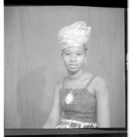 209. EAP449/2/29/209 Reference (shelfmark): EAP449/2/29/209 Title: A girl wearing a dress, head wrap, and necklace sitting face-forward in the studio. Collection Area: Endangered Archives Programme Languages: Not applicable Date Range: 2nd half od the 20th century Extent: 1 TIFF image
