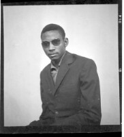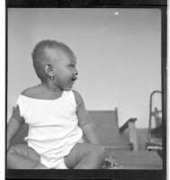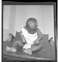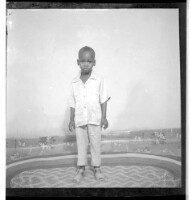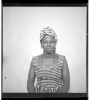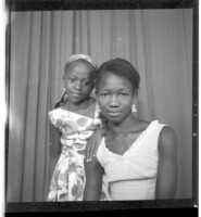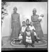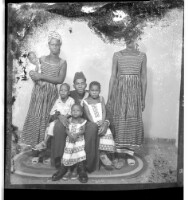 A man wearing a boubou and hat sitting face-forward holding three children on his lap, in between two women wearing dresses and head wraps, one holding a child (her face is scratched out) and the other standing face-forward in the studio.