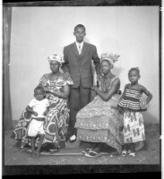 A man wearing a suit and tie standing face-forward in between two women wearing dresses, head wraps, and necklaces; a little boy and a little girl are sitting face-forward and in profile next to them in the studio.