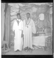 272. EAP449/2/29/272 Reference (shelfmark): EAP449/2/29/272 Title: Two men wearing boubous, head wraps, and prayer beads around their necks, both standing face-forward in a studio decorated with a sun rising on some surrounding trees. Collection Area: Endangered Archives Programme Languages: Not applicable Date Range: 2nd half od the 20th century Extent: 1 TIFF image