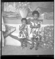 282. EAP449/2/29/282 Reference (shelfmark): EAP449/2/29/282 Title: Two little girls wearing dresses both standing face-forward in a studio decorated with a flower pot in front of a mosque. Collection Area: Endangered Archives Programme Languages: Not applicable Date Range: 2nd half od the 20th century Extent: 1 TIFF image