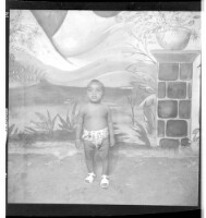 289. EAP449/2/29/289 Reference (shelfmark): EAP449/2/29/289 Title: A little boy wearing underpants standing face-forward in a studio decorated with clouds, flowers, and a flower pot on a little wall. Collection Area: Endangered Archives Programme Languages: Not applicable Date Range: 2nd half od the 20th century Extent: 1 TIFF image