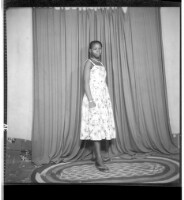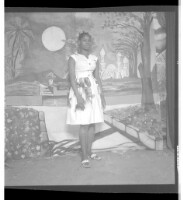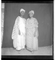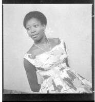 A woman wearing a dress, head wrap, and necklaces holding a baby on her lap sitting face-forward in between two girls wearing dresses and pages sitting face-forward' all on chairs in front of two girls wearing dresses, head wraps, and necklaces standing i