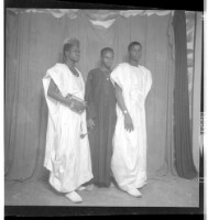 A man wearing a military uniform holding a baby on his lap in between two women wearing dresses and head wraps, all sitting face-forward in the studio.