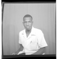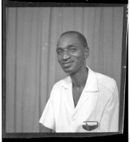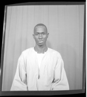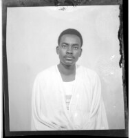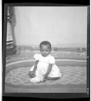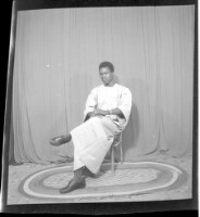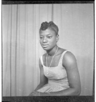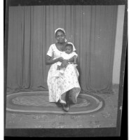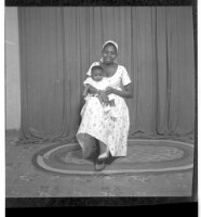 A woman wearing a dress, head wrap, and necklace holding a child on her lap sitting in profile in between a woman wearing a dress, pagnes, head wrap, and necklace standing face-forward and a girl wearing a dress and head wrap standing face-forward in the