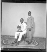 346. EAP449/2/29/346 Reference (shelfmark): EAP449/2/29/346 Title: Two men wearing shirts and pants, one sitting in profile and the other standing in profile, in the studio. Collection Area: Endangered Archives Programme Languages: Not applicable Date Range: 2nd half od the 20th century Extent: 1 TIFF image