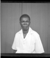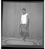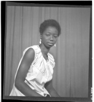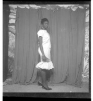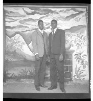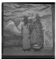 Two women wearing dresses, head wraps, and necklaces, one holding a child' both standing face-forward in a studio decorated with clouds, flowers, and a flower pot on a little wall.
