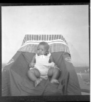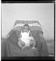 464. EAP449/2/29/464 Reference (shelfmark): EAP449/2/29/464 Title: A baby wearing overalls sitting in profile on a chair in the studio. Collection Area: Endangered Archives Programme Languages: Not applicable Date Range: 2nd half od the 20th century Extent: 1 TIFF image