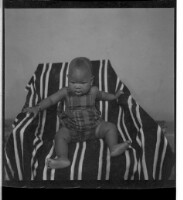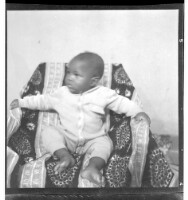 477. EAP449/2/29/477 Reference (shelfmark): EAP449/2/29/477 Title: A baby wearing overalls sitting in profile on a chair in the studio. Collection Area: Endangered Archives Programme Languages: Not applicable Date Range: 2nd half od the 20th century Extent: 1 TIFF image