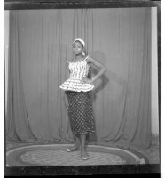 472. EAP449/2/29/472 Reference (shelfmark): EAP449/2/29/472 Title: A woman wearing a dress, pagne, head wrap, and necklace standing in profile in the studio. Collection Area: Endangered Archives Programme Languages: Not applicable Date Range: 2nd half od the 20th century Extent: 1 TIFF image