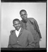 491. EAP449/2/29/491 Reference (shelfmark): EAP449/2/29/491 Title: Two men, one wearing a jacket sitting face-forward in front of the other wearing a boubou and glasses bending over face-forward in the studio. Collection Area: Endangered Archives Programme Languages: Not applicable Date Range: 2nd half od the 20th century Extent: 1 TIFF image