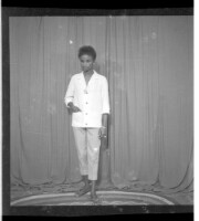 501. EAP449/2/29/501 Reference (shelfmark): EAP449/2/29/501 Title: A woman wearing a shirts and pants standing in profile in the studio. Collection Area: Endangered Archives Programme Languages: Not applicable Date Range: 2nd half od the 20th century Extent: 1 TIFF image