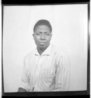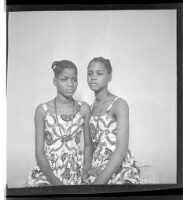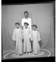 Two men wearing suits, ties, and glasses sitting in profile, another wearing a shirt, pants, and glasses holding a book in his hand sitting face-forward next to a woman wearing a dress, head wrap, and necklace holding a book in her hand sitting face-forwa