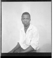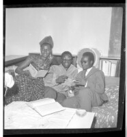 Two men, one wearing a suit, tie, and glasses sitting in profile, and the other wearing a shirt, pants, and glasses holding a book in his hand sitting face-forward next to a woman wearing a dress, head wrap, and necklace holding a book in her hand sitting