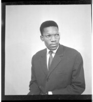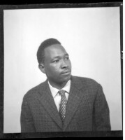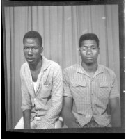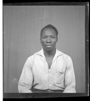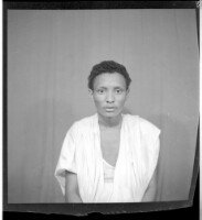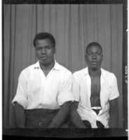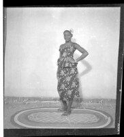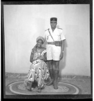 A man wearing a military uniform standing face-forward with his arm around a woman wearing a dress, head wrap, and necklace sitting face-forward in the studio.