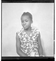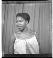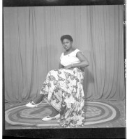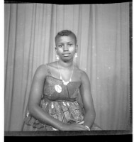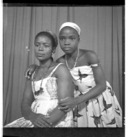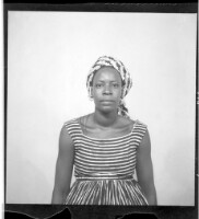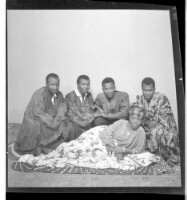 A woman wearing a dress, head wrap, and necklace laying face-forward in front of four men wearing boubous, all crouching, two face-forward and two in profile, in the studio.