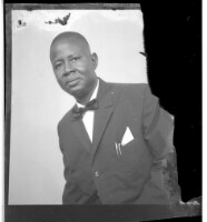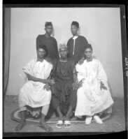 Five men wearing boubous and hats, one also wearing glasses, three of whom are sitting face-forward in front of the other two standing in profile in the studio.