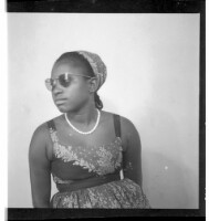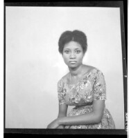 734. EAP449/2/29/734 Reference (shelfmark): EAP449/2/29/734 Title: A woman wearing a dress and head wrap sitting face-forward in the studio. Collection Area: Endangered Archives Programme Languages: Not applicable Date Range: 2nd half od the 20th century Extent: 1 TIFF image