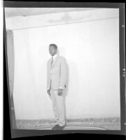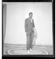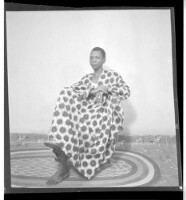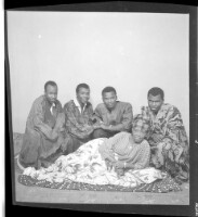 A woman wearing a dress, head wrap, and necklace laying face-forward in front of four men wearing boubous and crouching down, two face-forward and two in profile in the studio.