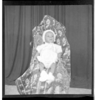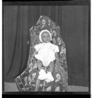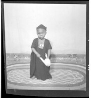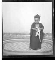 A woman wearing a shirt and skirt standing in profile in between two boys wearing shirts and pants, one wearing a hat, and a little girl wearing a dress and head wrap, all standing face-forward in a studio decorate with three palm trees and some birds fly