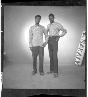 790. EAP449/2/29/790 Reference (shelfmark): EAP449/2/29/790 Title: Two men wearing shirts and pants both standing face-forward in a studio with a board in the background with A. SAKALY written on it. Collection Area: Endangered Archives Programme Languages: Not applicable Date Range: 2nd half od the 20th century Extent: 1 TIFF image