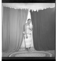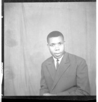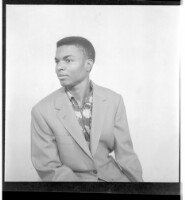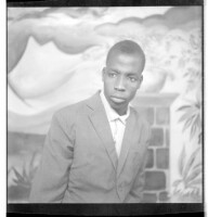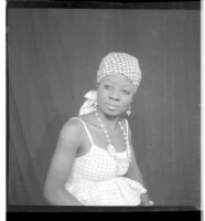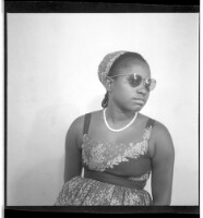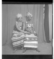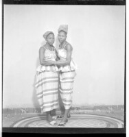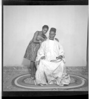 A girl wearing a dress standing in profile with her arm around an old man wearing a boubou and hat holding prayer beads and sitting face-forward in the studio.